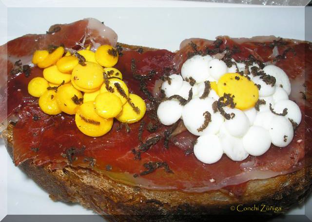 Tostamos el pan, sobre el mismo colocamos lonchas de jamón y sobre el jamón ponemos las gotas de clara y yema de huevo, la distribución dependerá un poco de nuestra imaginación y creatividad.