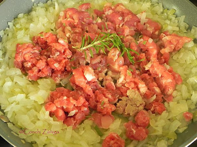glasearemos la cebolla, a continuación añadimos la carne picada y una ramita de