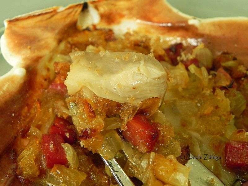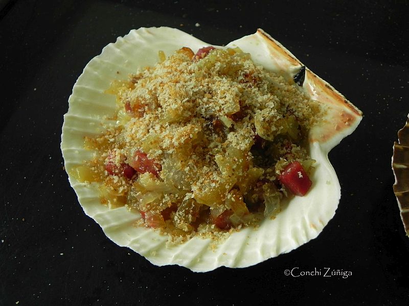 personata sobre la concha de vieira, salamos ligeramente, cubrimos con la